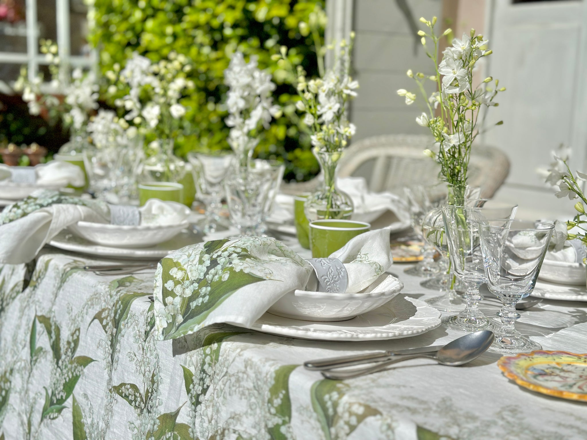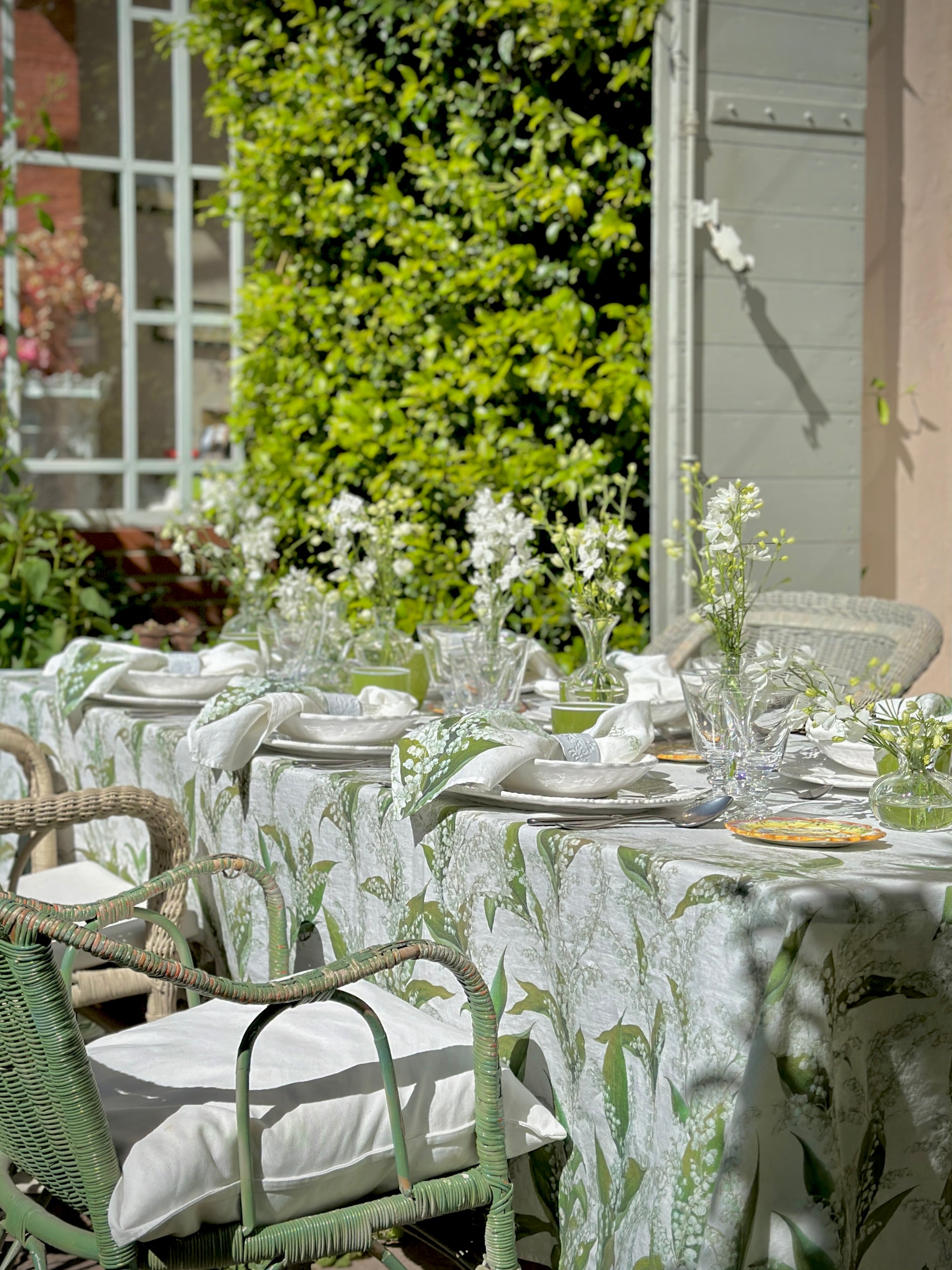 On arching stems, pearl-like ivory buds open into white bells amongst large, lush green leaves. Imagined in a soothing palette of delicate greens with white, our linen homage to Lily of the Valley is a versatile design that conjures thoughts of purity, sincerity, and happiness. A perfect muse for the table that will suit many interior and tabletop styles.